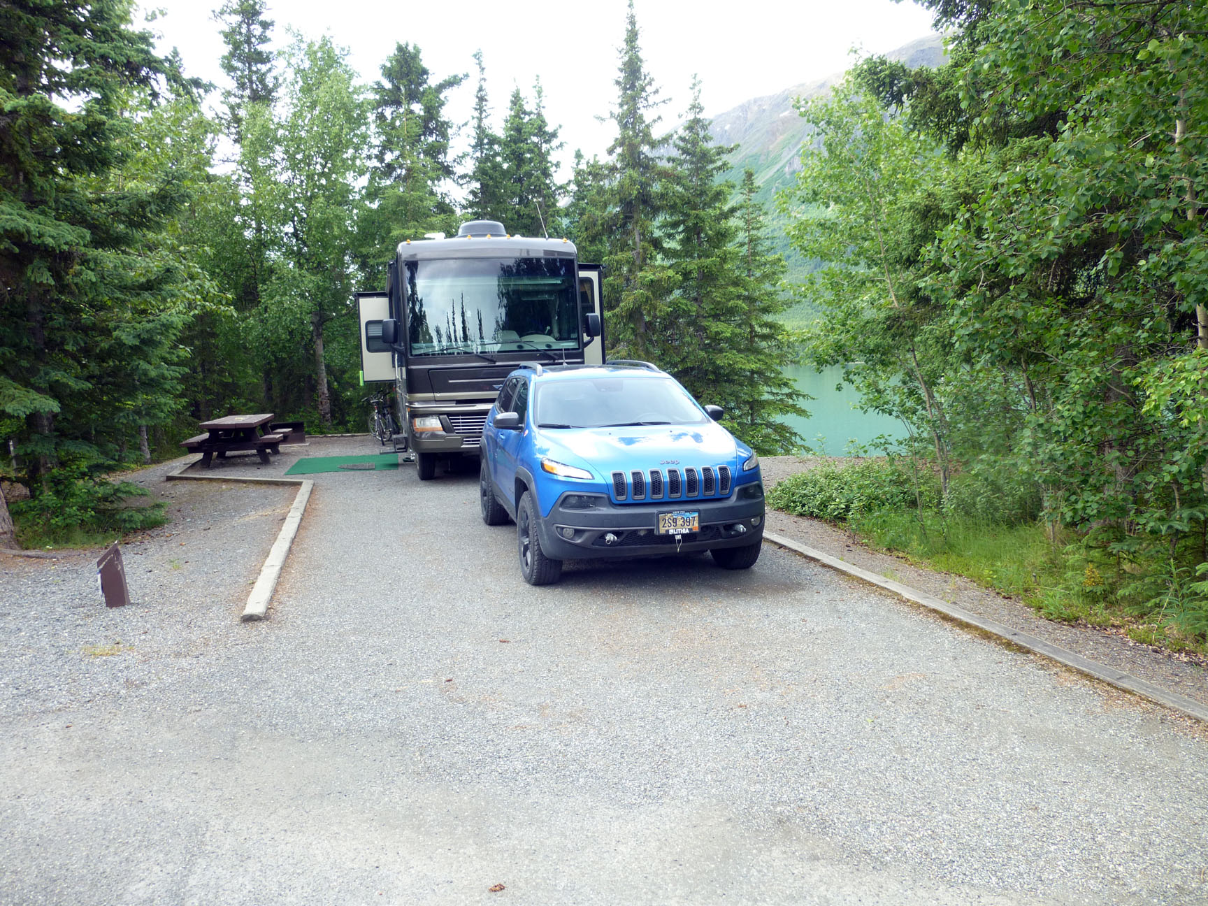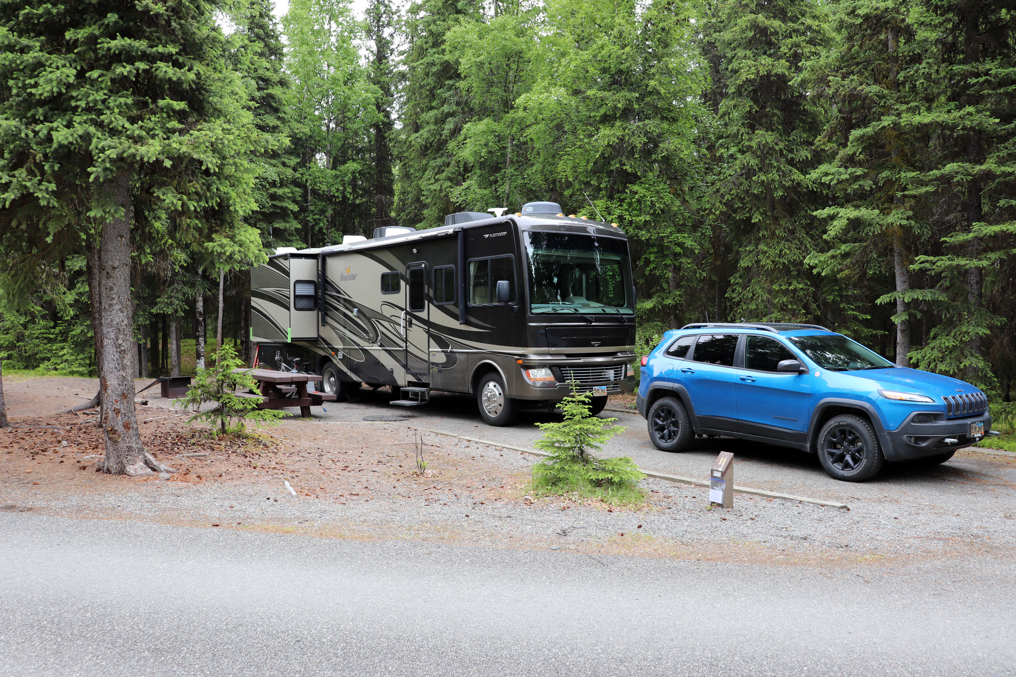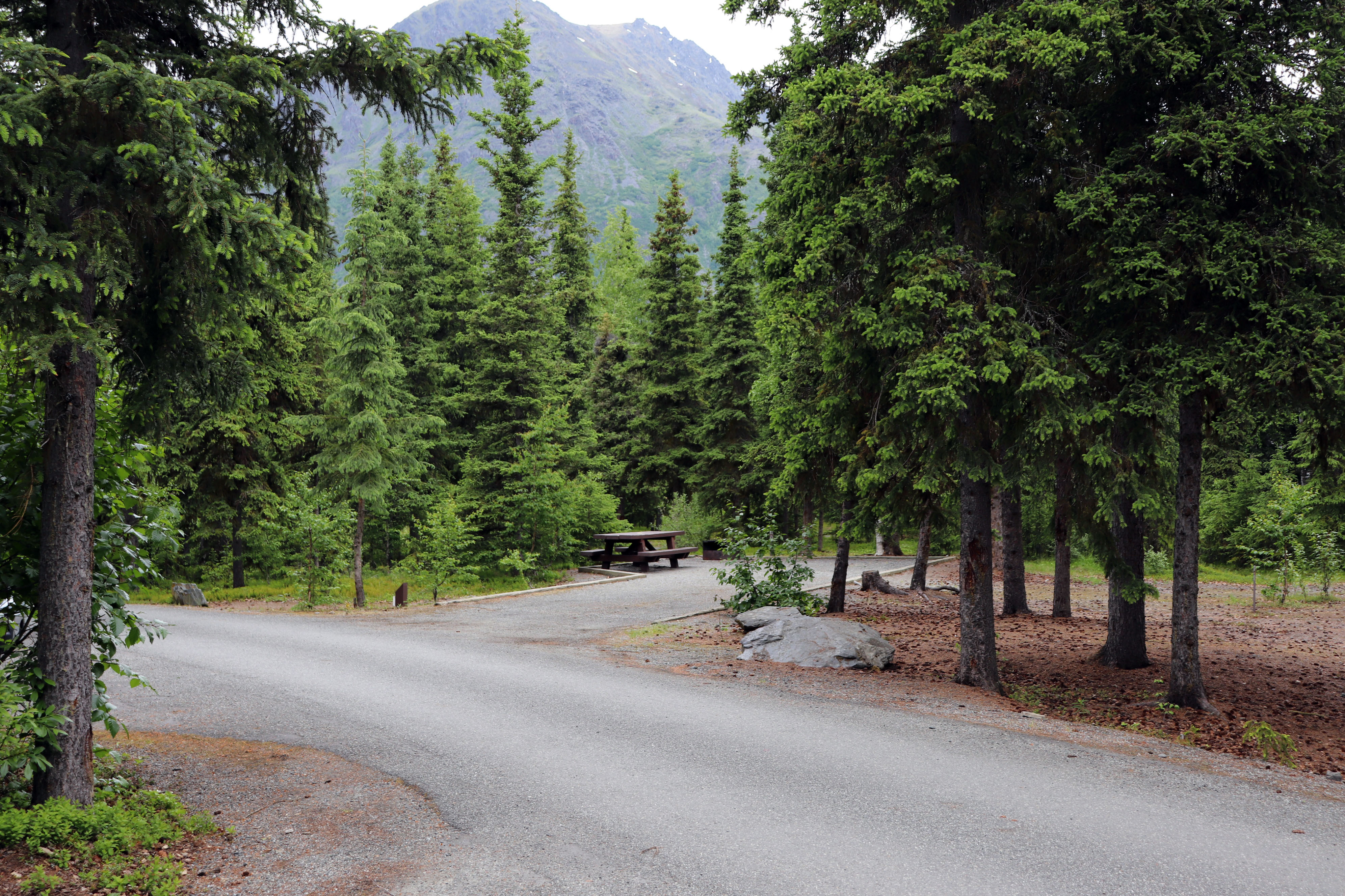 • Rated as Excellent. Beautiful, well maintain camp ground. Paved roads and level sights. Located on Quartz creek and Kenai lake. Each site has a fire pit and a picnic table. Water spigots are located throughout the campground. There is a combination of very clean flush toilets and pit toilets. There is a dump station across the street cost of $8.00, not included with camp site fee. Hosts are courteous, friendly, and willing to help in any way. One of the nicest camp grounds in the area and fills up fast, so reservations in advance are highly recommended. There are a couple of first come first serve sites, but go quickly. The only negative, is there are some tree branches that scrape the top of large vehicles. Highly recommended, would stay there again. Rated as: Excellent.